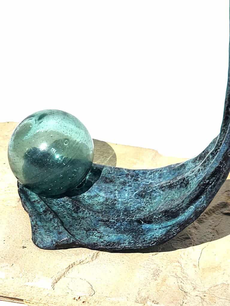 I sculpted “One Wild and Precious Life” in memory of Albert Young, my mentor and an international glass artist who passed in February 2025. This elegant figure with her blue patina is soaring in the air, poised to hold a garland of goals and passions. Rising and weightless, One Wild and Precious Life captures how Albert’s attention lifted others. The figure’s long flowing train represents the long-lasting impact of one person on the world.