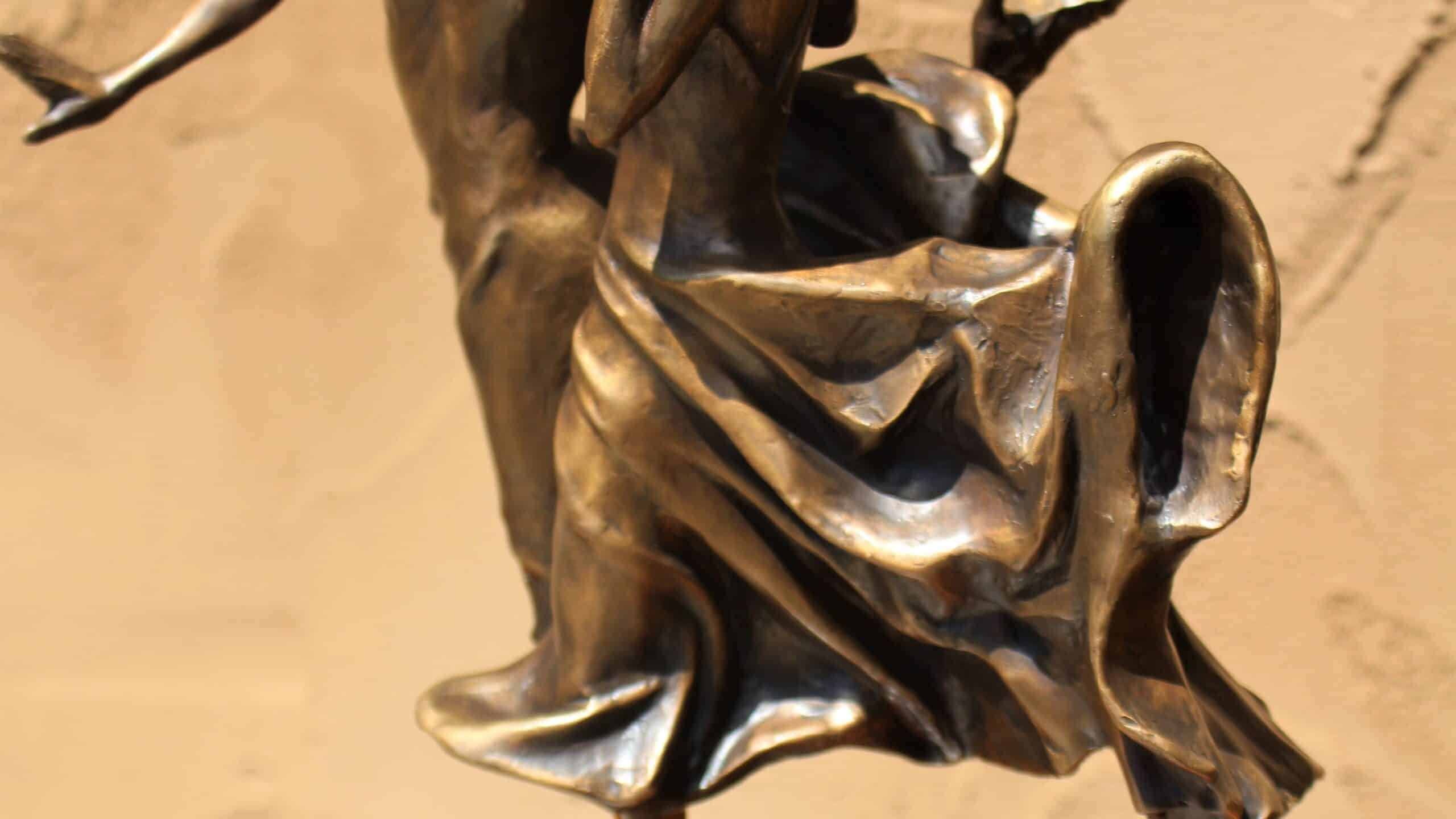 Tied in Knots captures the unrestrained enthusiasm shared between two best friends. The figures are intertwined physically yet moving forward. This particular sculpture is tricky to cast. The silhouettes create spaces between the torsos and legs. The vorticity of the figures’ skirts and legs is central to the sculpture’s joy and levity.